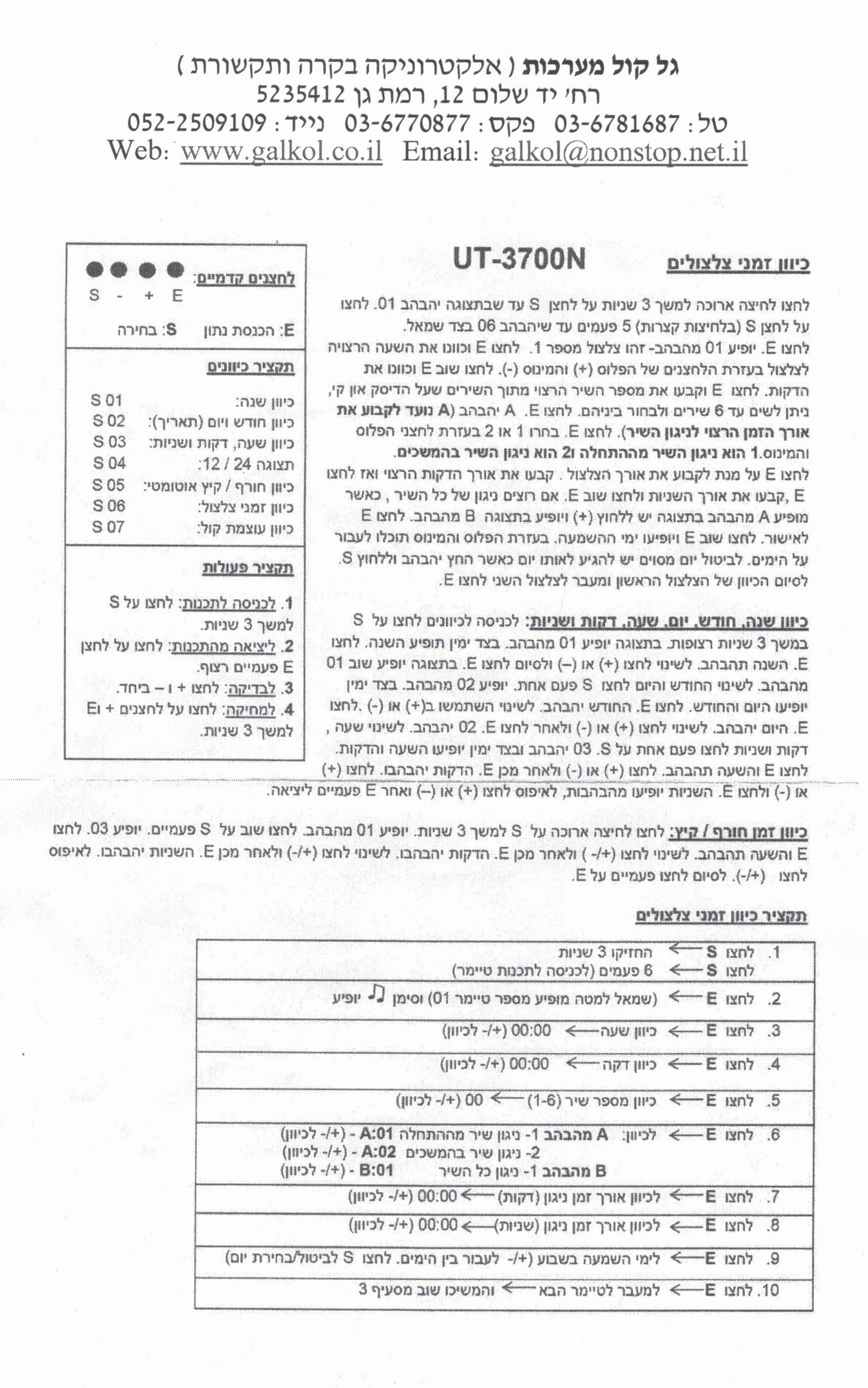 הוראות תכנות שעון צלצולים UT3700N